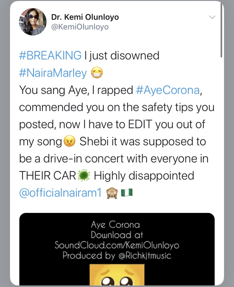 Kemi Olunloyo who is well known for her controversial lifestyle has in a recent tweet admitted disowning fast rising Nigerian rapper, Naira Marley.