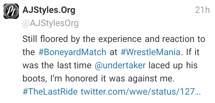 AJ Style taking to his twitter post, he wrote; " Still floored by the experience and reaction to the #BoneyardMatch at #WrestleMania . If it was the last time @undertaker laced up his boots, I’m honored it was against me."