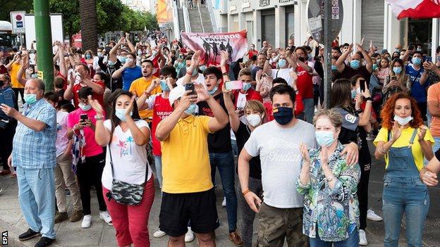 The game featured virtual support and simulated crowd noise, with the empty stands painted with images of what looked like supporters wearing the clubs colours.