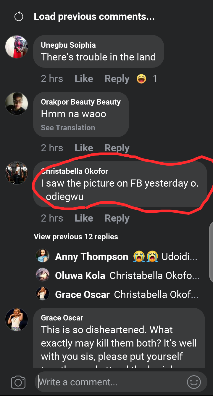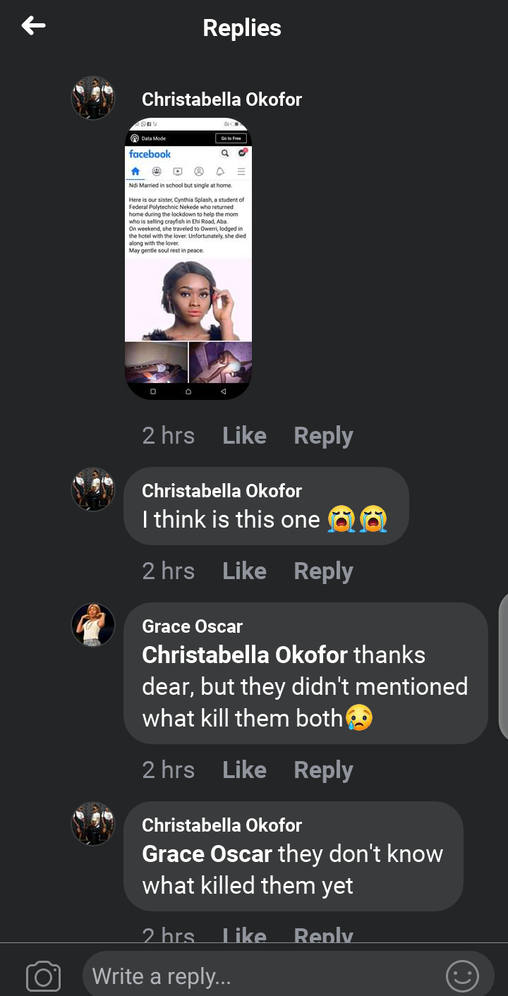 It was until other followers started comforting her and advising her on wether or not to attend the burial that one of them indicated it was the man who died with his lover, a student of Nekede.