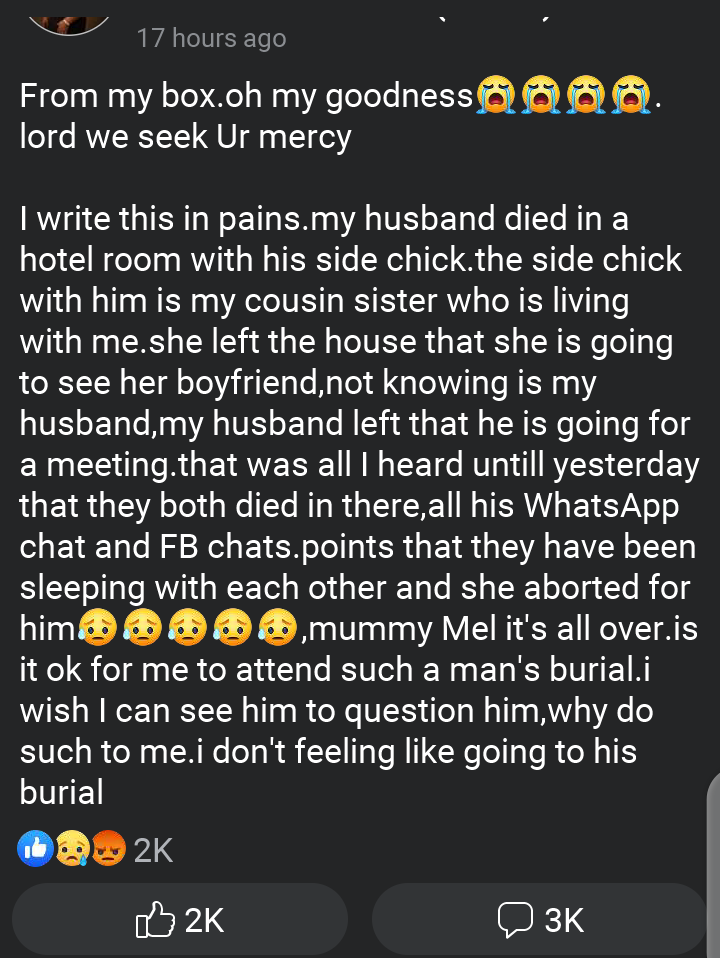 "I write this in pains. My husband died in a hotel room with his side chick. The side chick with him is my cousin sister who is living with us.